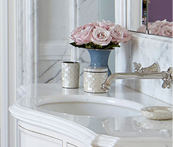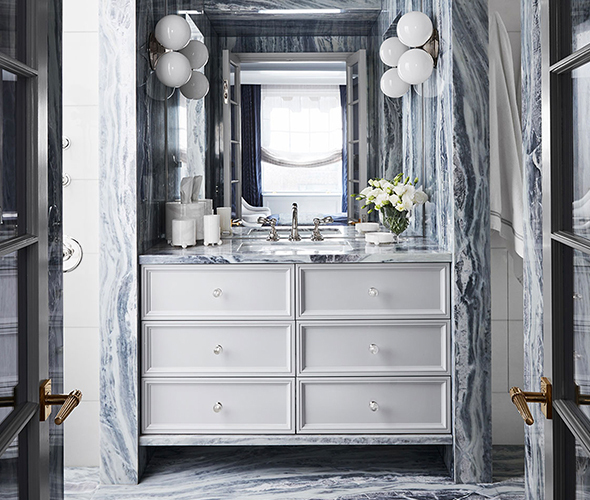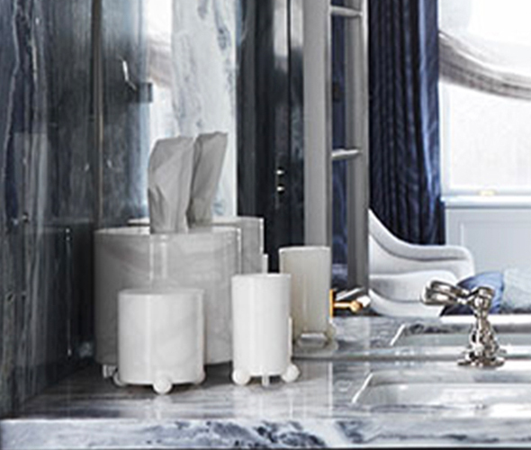 Designer Caleb Anderson transformed the en-suite bath in his Sutton Place apartment with dramatic gray and blue marble and pure white stone. The custom vanity features fixtures by Waterworks, and whimsical bubble sconces by Italia. The white marble countertop accessories are from our Boule Collection, designed by Jamie Drake for Labrazel.