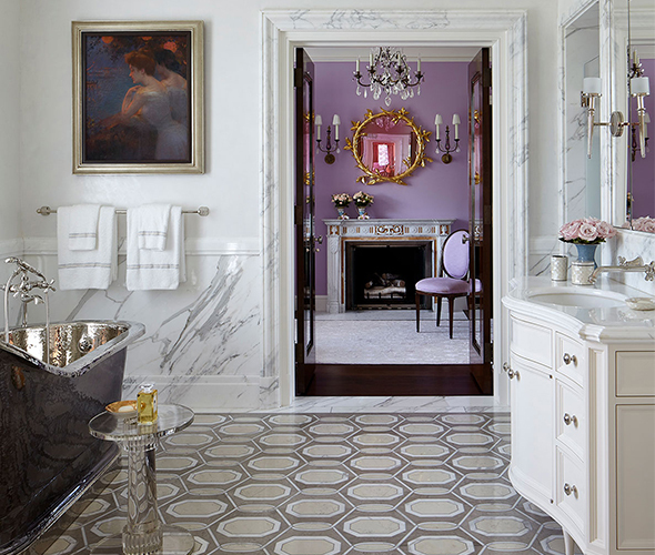 For this top-to-bottom update of a 1913 property, designer Jamie Drake seamlessly blended modern luxury with the home's traditional Georgian style. Freestanding bathtub by Kohler, tile flooring by Ann Sacks, sconces by Smith/Jones. Bath accessories from Labrazel's White Agate Collection sparkle on the custom vanity.